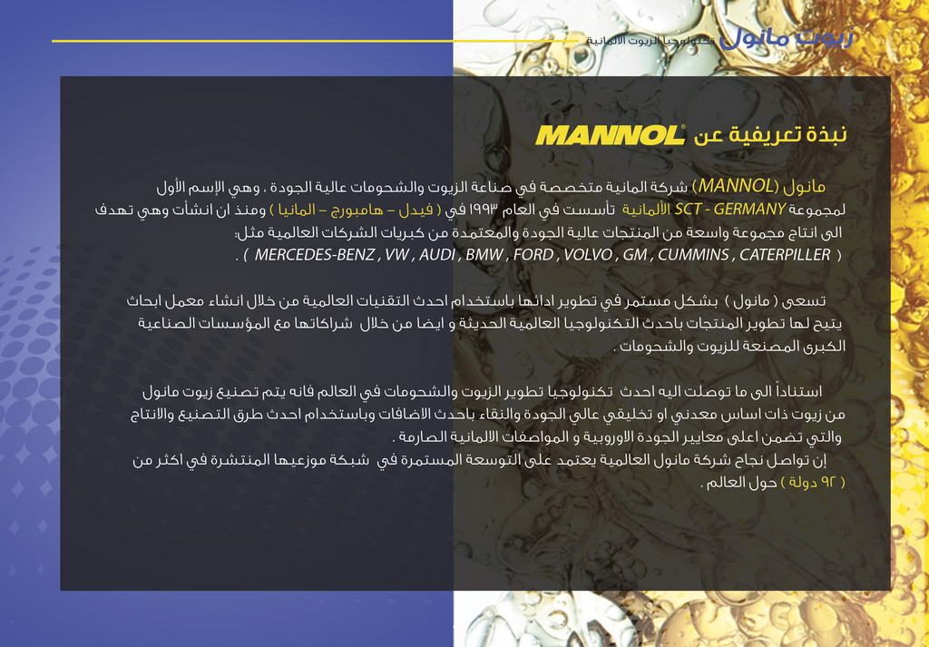 MANNOL offers a full range of standard and special lubricants, working fluids and a wide range of car care products at competitive prices. A modern and unique packaging design, short delivery time and approved OEM specification as well as EU and US quality complete the picture. With a production capacity of 400 tons of lubricants per day we have ensured the success of our clients since 1993.